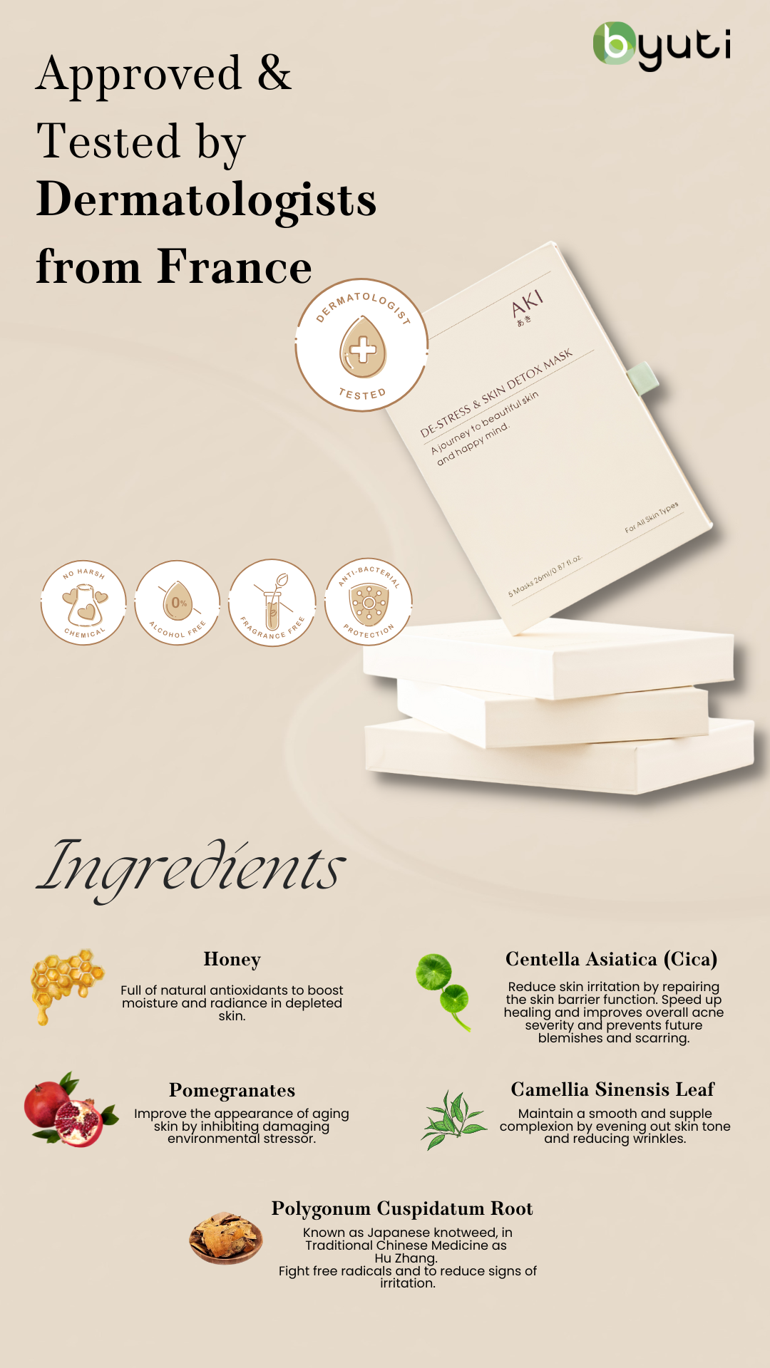 Our mask is dermatologically tested by SGS France, ensuring that it's safe for all skin types. We take pride in carefully formulating our skincare products, and the AKI mask is no exception. Packed with natural ingredients like pomegranate, centella asiatica, honey, polygonum cuspidatum, and camellia sinensis leaf, this mask is designed to detoxify, repair, and hydrate your skin.